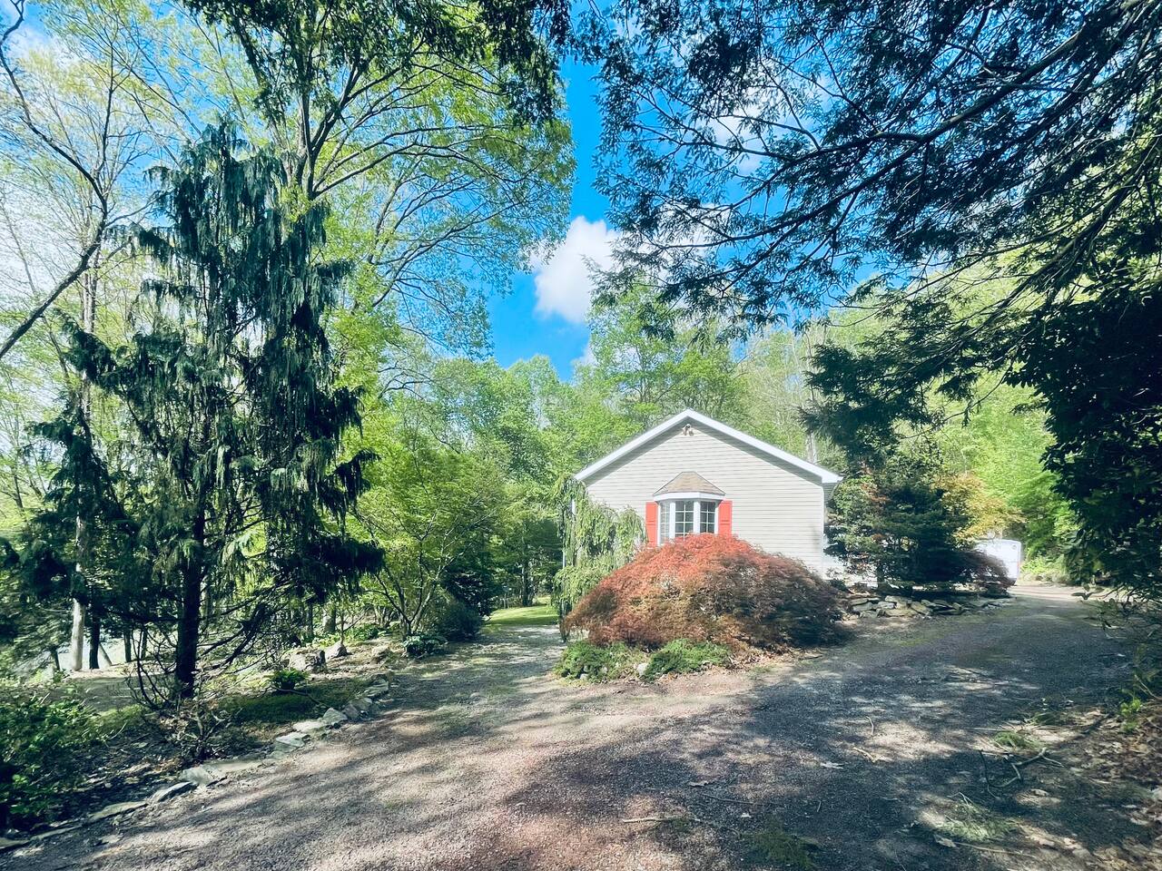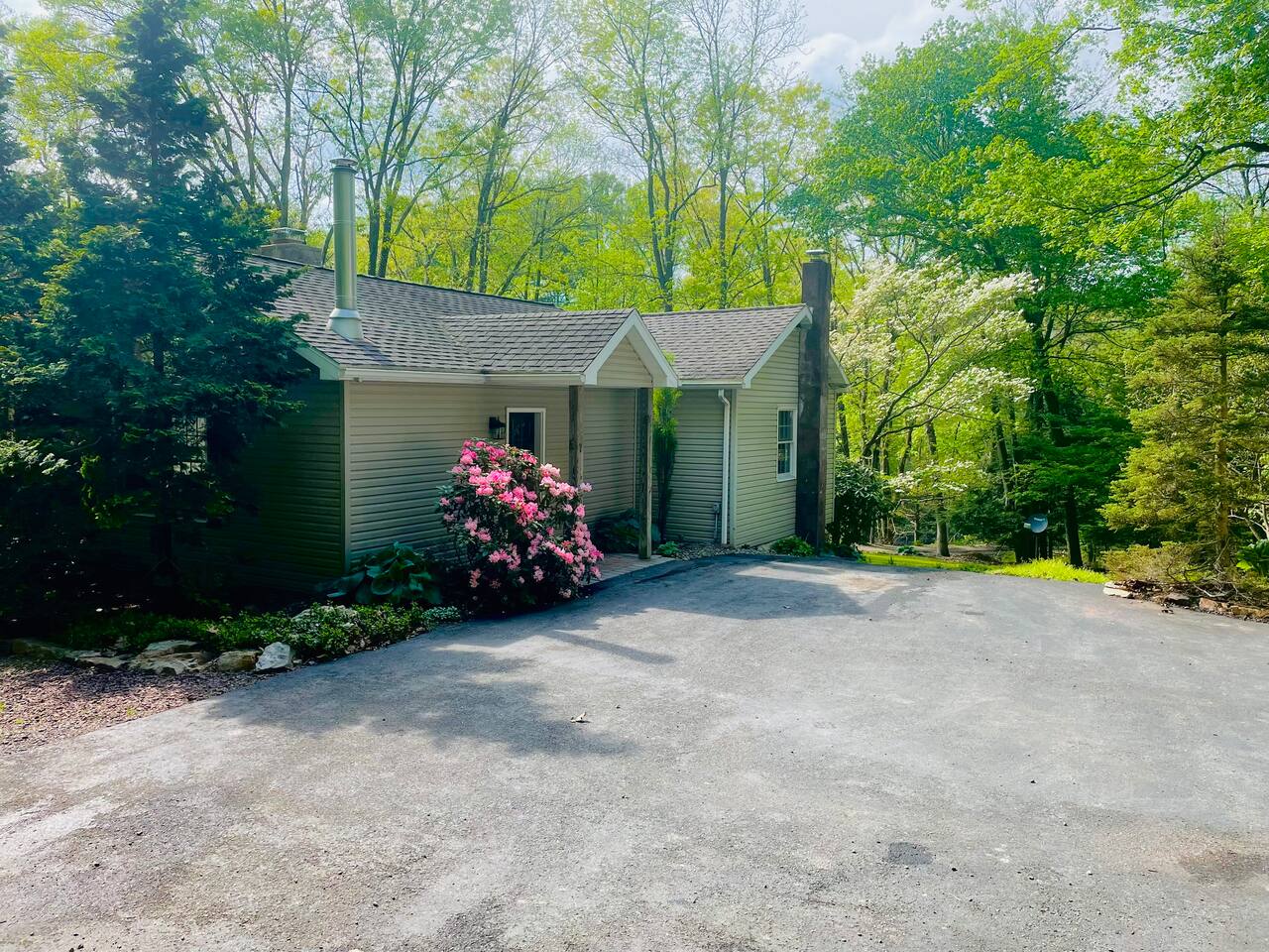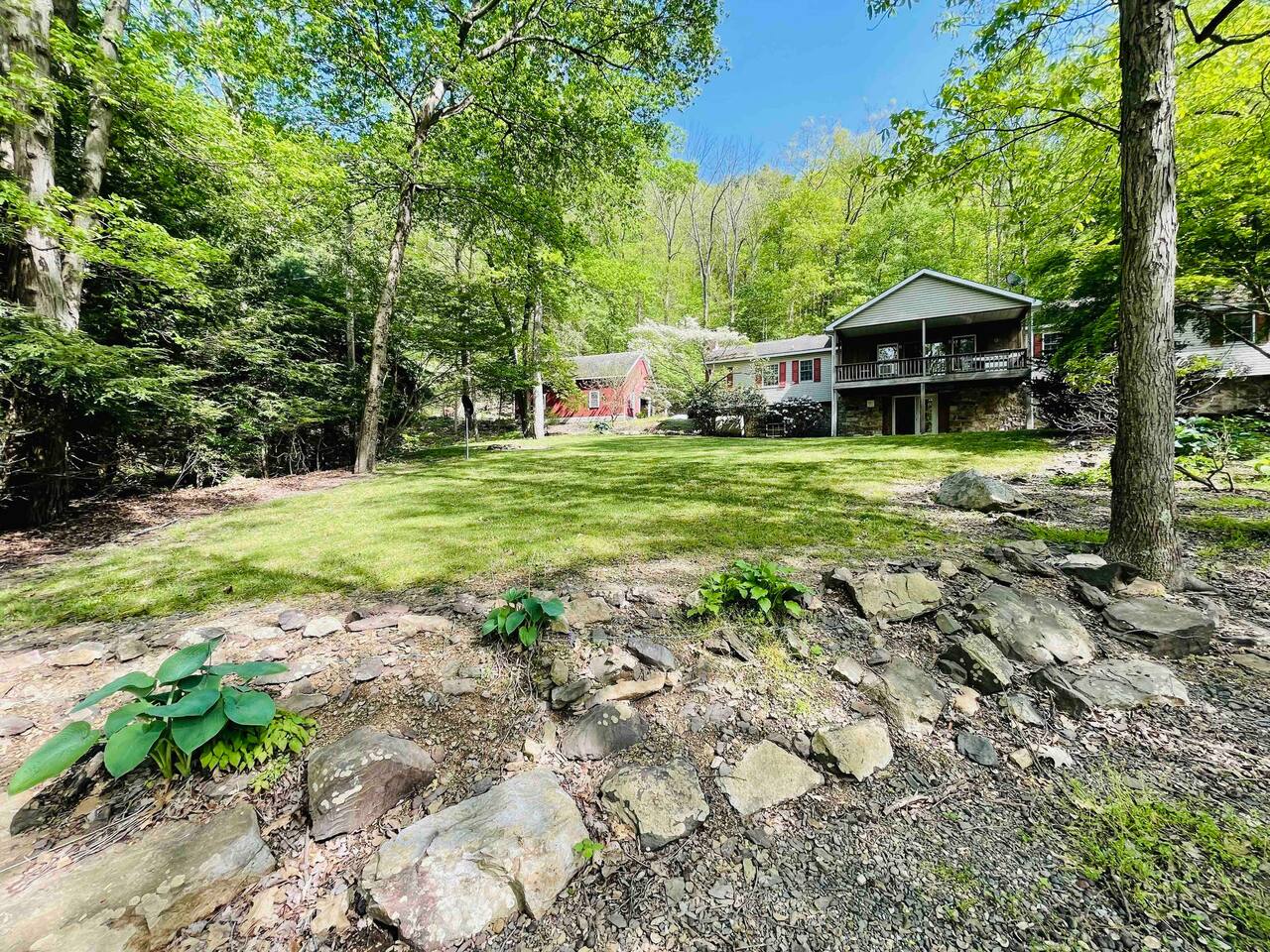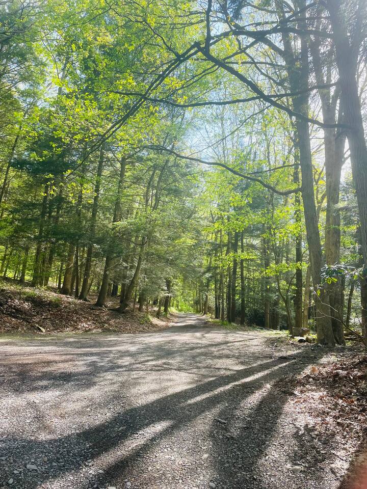 The property is situated on a private gravel lane, about half a mile from the main road. You'll drive by several other private residences as you arrive. Hiking and biking trails are accessible within a few miles of Hidden River Lodge. The Little Schuylkill River can be accessed directly from the property. A 15 minute drive (7.5 miles) into Hamburg will take you to Cabela’s, Lowe's, Aldi, Starbucks, Wawa, Walmart, and a wide variety of dining options.