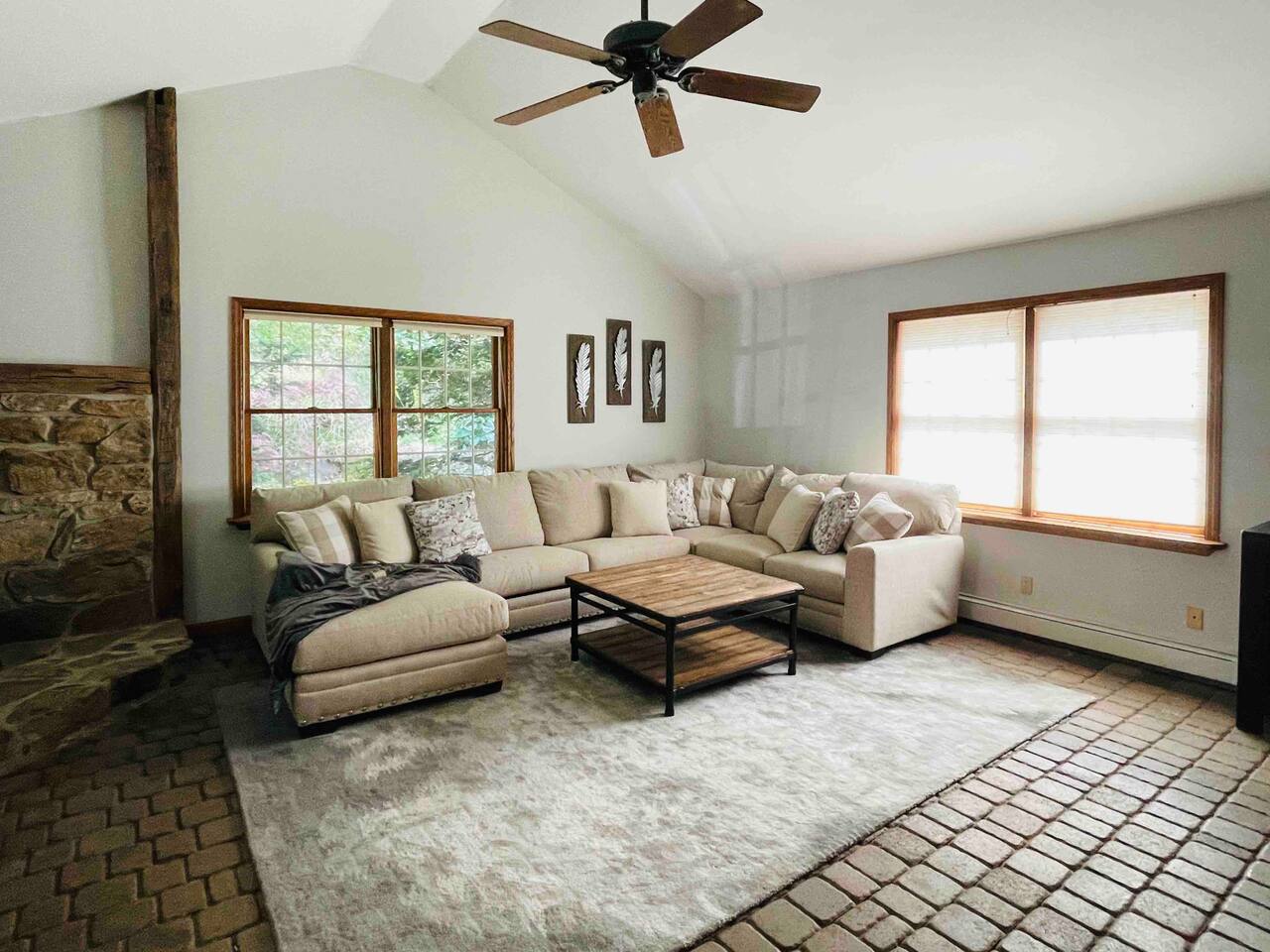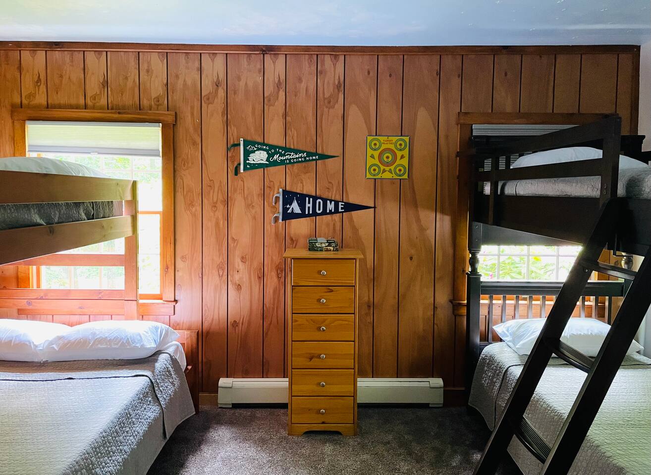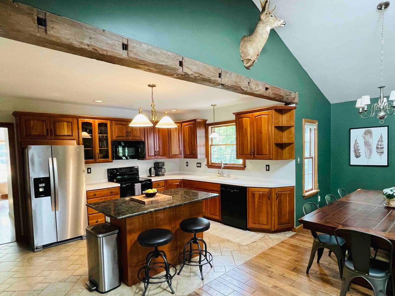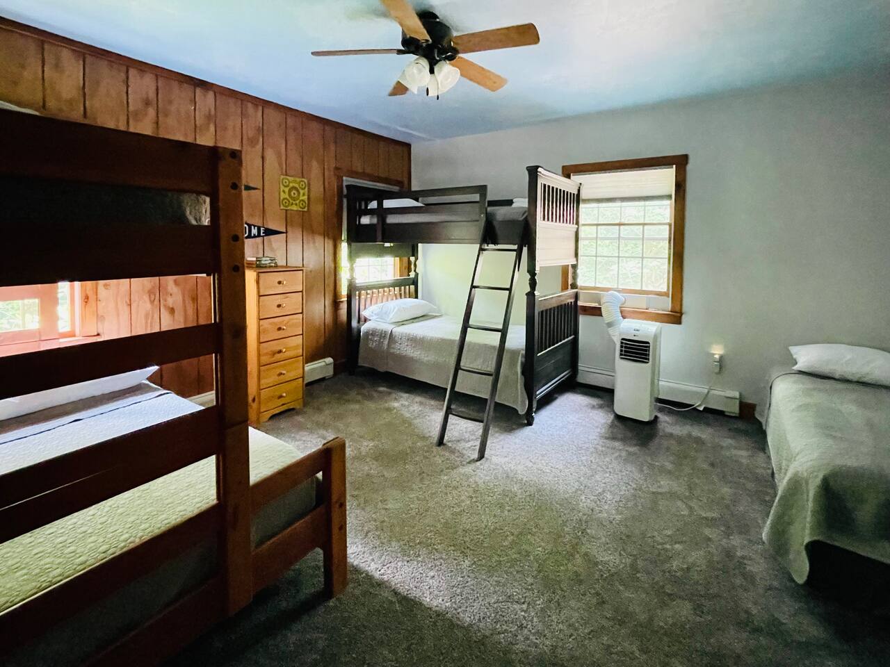 Hidden River Lodge is tucked between Hawk Mountain and the Little Schuylkill River. The property is serene and private, surrounded by woods on all sides. The spacious living room and dining room have vaulted ceilings and opens to the kitchen. The large dining room table easily seats up to 10 people. Sliding doors off of the living room open to a deck with a grill and spectacular forest and river views. The master bedroom is off of the kitchen. It offers a queen bed and has a private bathroom with a large walk-in shower. The bunk room down the hall from the living room has four twin beds and one full bed. It’s the perfect space for kids with toys, games, and books. A full bathroom is next to the bunk room. The “stone room” is through French doors off of the living room. It has vaulted ceilings and has a large, plush sectional that has a pull-out bed as a sleeping option. The room also has a television and is a great space for watching a movie or spending time with family and friends. Downstairs, a third living area doubles as a game room. Doors open onto a patio with access to the front yard. A short walk brings you down to the river’s edge for fishing, kayaking, and swimming. Off of the downstairs living room is a third bedroom. This cozy room has a full bathroom, queen-sized bed, and a workspace. The walk-in closet is large enough for a pack-n-play. The laundry room is also downstairs, which you are welcome to use. Hawk Mountain, a bird sanctuary, is located directly behind Hidden River Lodge. Hawk Mountain offers a variety of very well maintained hiking trails and is a popular location for bird watchers. Other hiking trails in the area are accessible via the main road, including the famous Appalachian Trail. You can find trail maps online. The house is equipped with WiFi. Please note that due to the remoteness of the property, the connection can be limited. Be advised to consider this if planning to work and/or stream content during your stay. Otherwise, embrace the opportunity to unplug and enjoy nature and any fellow guests! Hidden River Lodge is a quiet and peaceful retreat, it's the perfect getaway!